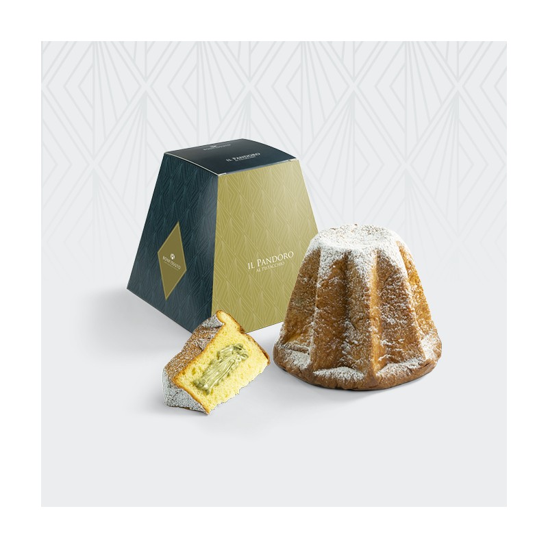 Pandoro al pistacchio con bustina di zucchero a velo e sac a poche di crema al pistacchio al suo interno.