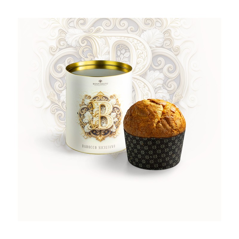 Panettone Barocco impasto con farine di grani antichi Siciliani, farcito con fragoline, canditi di arancia e limoni di Sicilia e con glassa alle nocciole.